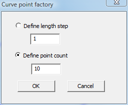 You can either define point count directly or distance between each point that will be generated on curve. After pressing OK on Curve Point Factory Dialog Model selection cycle will begin for you to select the curve entities to generate points on.