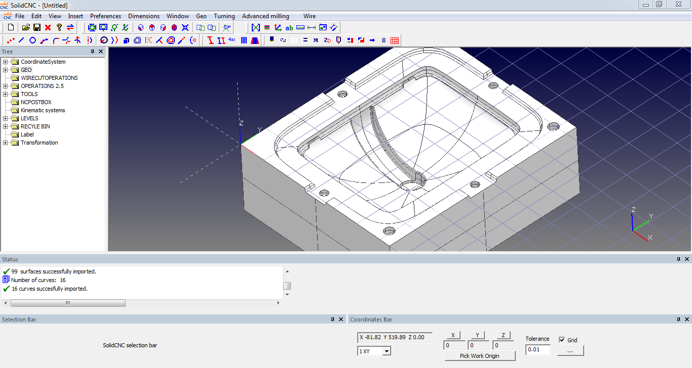 SolidCNC has a geometry kernel that had been developped by company it self and there is not an external dependency. SolidCNC can import IGES , DXF , VRML and STL files from other CAD-CAM systems and make its own geometry objects , render them by open GL. There are basic modelling functionality that lets users to make lines , arcs , curves , surfaces and primitive solid bodies from scratch. Users can use many interactive functions that SolidCNC apply on the geometry entities.
